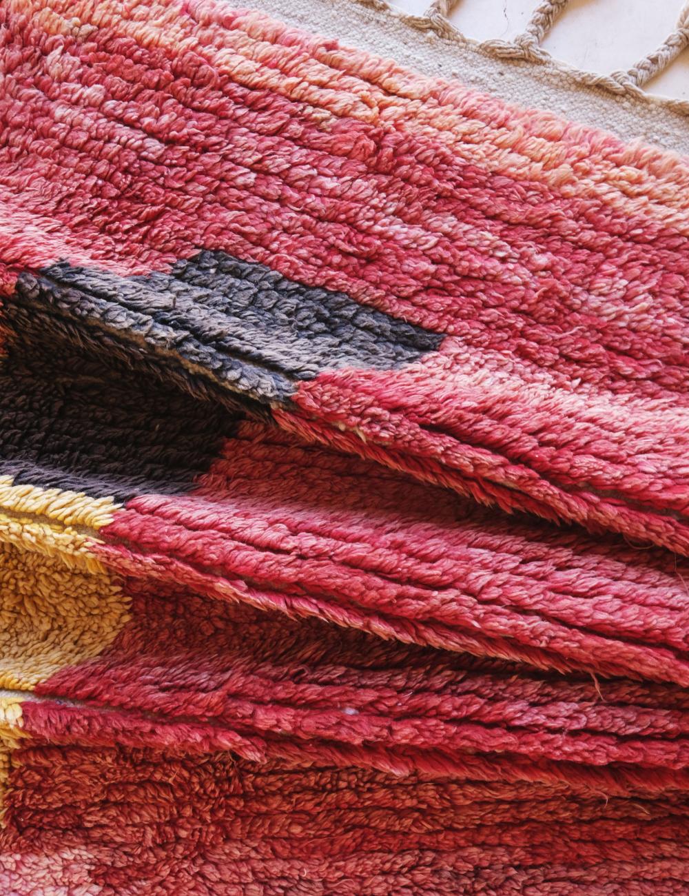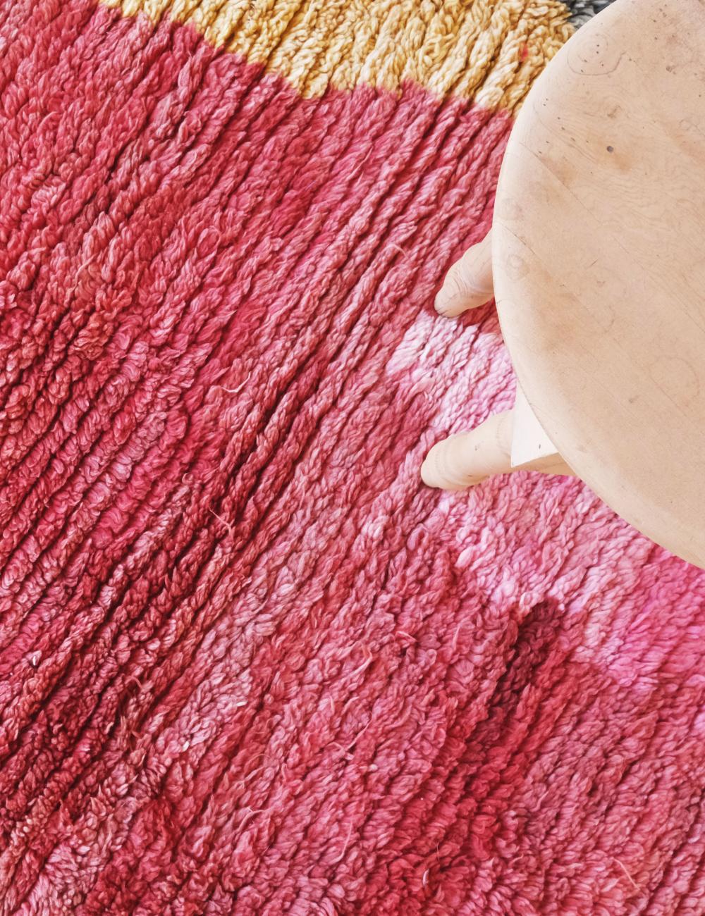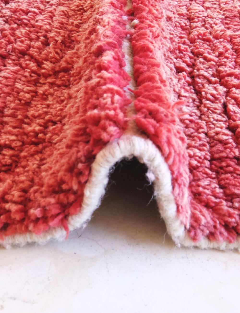 This contemporary Moroccan rug blends bold abstract design with the soulful texture of handwoven Berber craftsmanship. Its painterly composition—softly shifting from deep rose and terracotta to warm blush tones—creates a striking visual gradient that feels both modern and deeply artisanal.