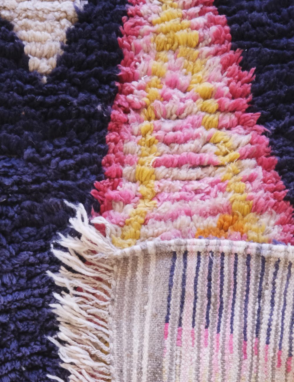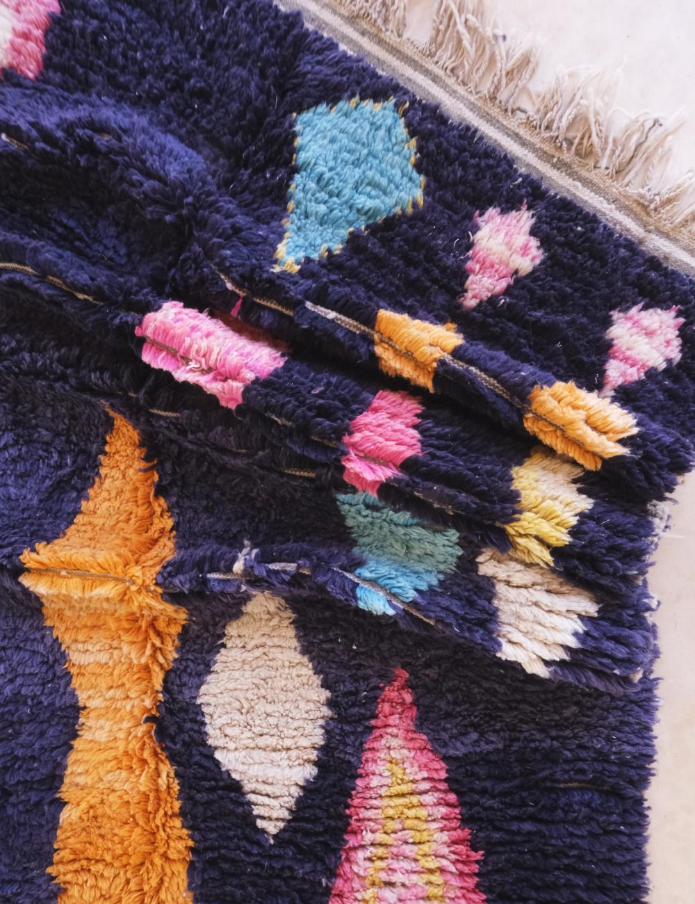 Make a bold statement with this handwoven Moroccan wool rug — a perfect fusion of vivid artistry and timeless craftsmanship. Its deep navy base comes alive with bursts of pink, orange, turquoise, and yellow diamonds, creating a striking geometric rhythm that energizes any room.