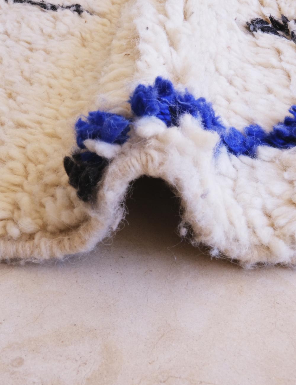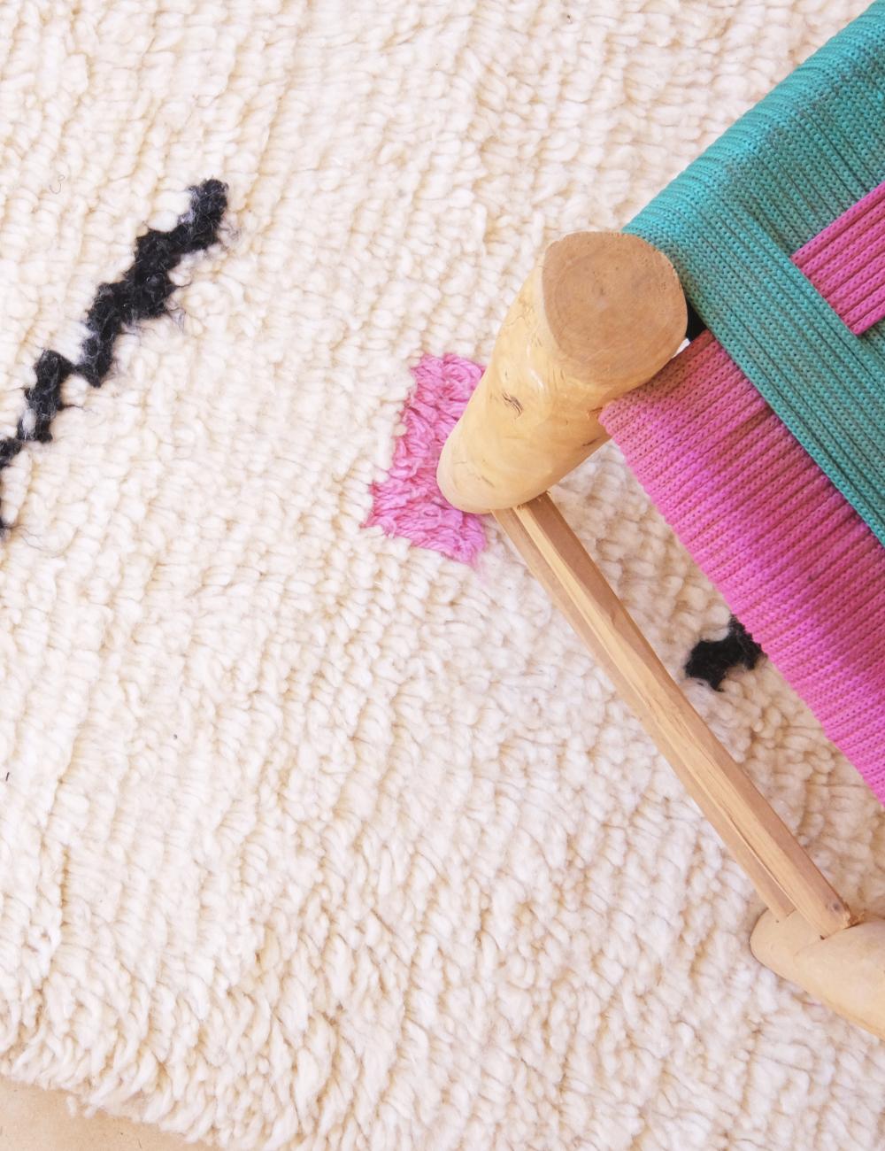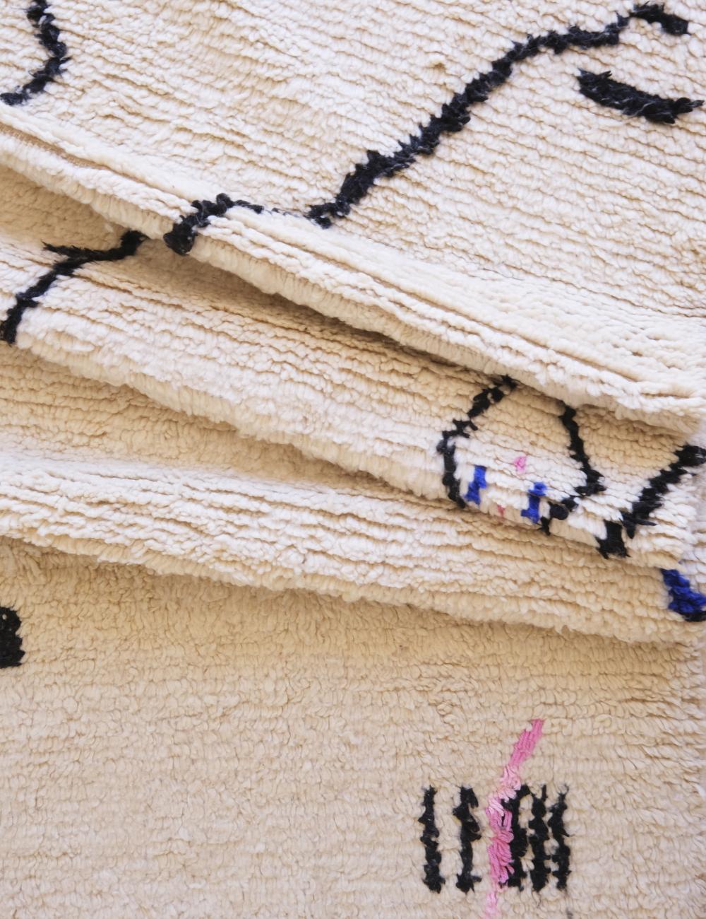 This modern Azilal rug embodies the perfect fusion of minimalism and Moroccan artistry. Handwoven by Berber women in the Atlas Mountains, it features an ivory wool base adorned with abstract geometric motifs in shades of pink, black, and blue. The clean lines and playful composition give it a modern art-inspired feel while staying true to the soulful essence of Moroccan weaving.