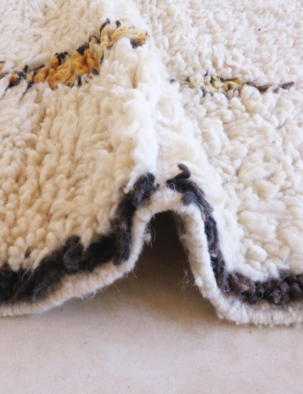 Caring for your Moroccan rug is simple! For regular maintenance, we recommend gently vacuuming it 1-2 times a week (use a suction-only attachment, without a beater bar) and air it outside every few months. For minor spills, act quickly by blotting the area with a clean, dry cloth. If needed, use a small amount of water and a gentle soap. For deep cleaning, we strongly recommend seeking a professional rug cleaner who specializes in wool carpets to preserve the rug's natural fibers and vibrant colors for years to come.