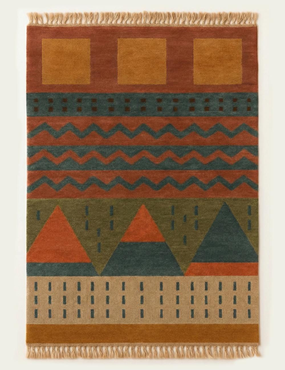 The composition blends modern Berber-inspired geometry with a balanced, architectural layout. Graphic bands, zigzag lines, squares, and triangular forms are layered rhythmically across the surface, creating movement and visual structure. The earthy palette—terracotta, olive green, mustard, sand, and muted blue—adds warmth while maintaining a refined, modern aesthetic.