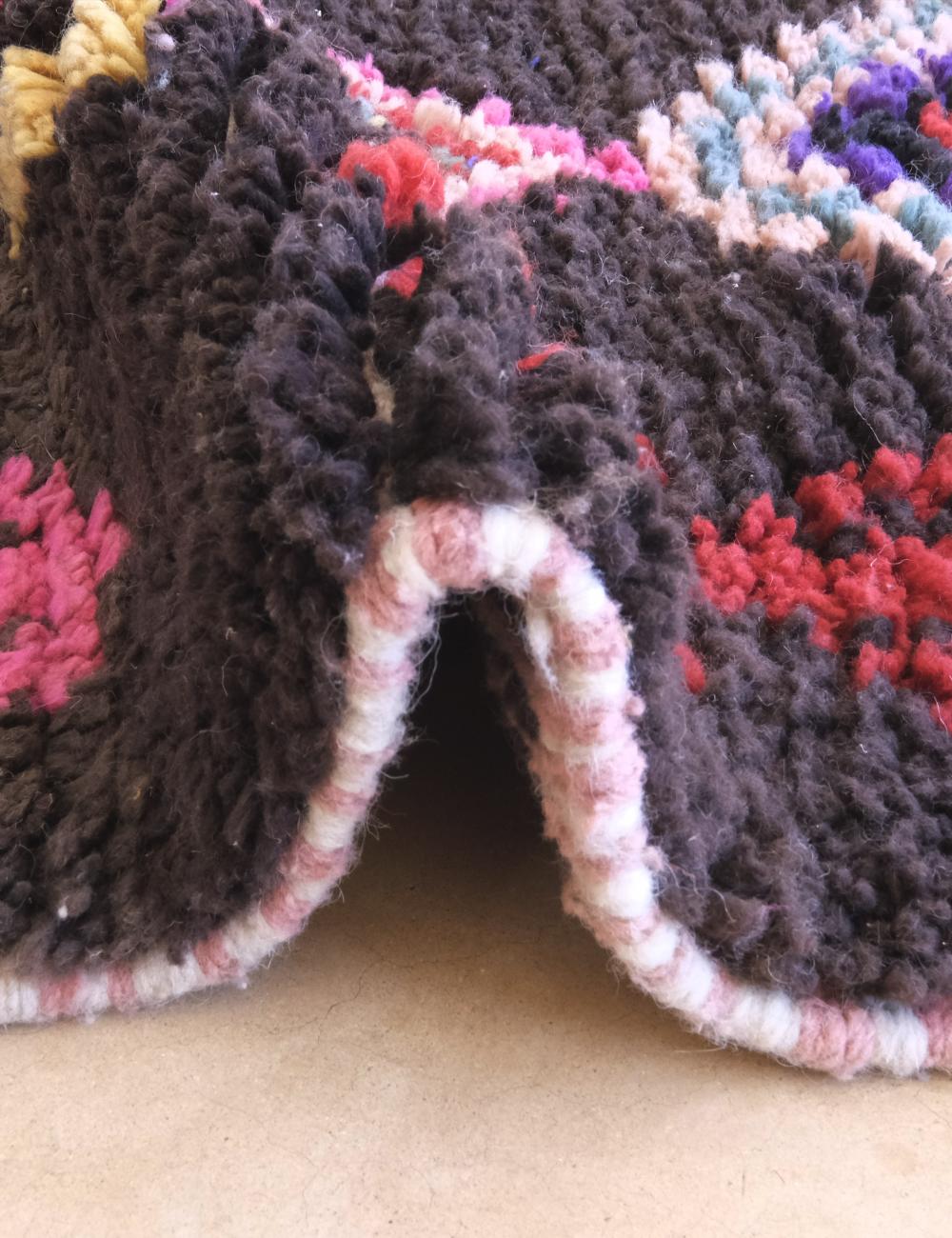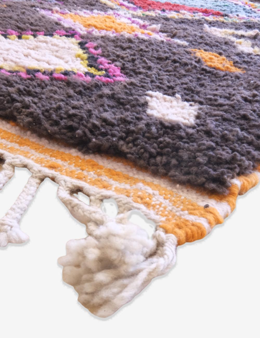 This Moroccan runner rug brings vibrant color and cultural energy to any space. Handwoven by Berber artisans in the Atlas Mountains, it features a deep charcoal base enlivened by vivid diamond motifs in shades of orange, magenta, blue, and gold. Each symbol tells a story of protection, strength, and connection — a true work of woven art.