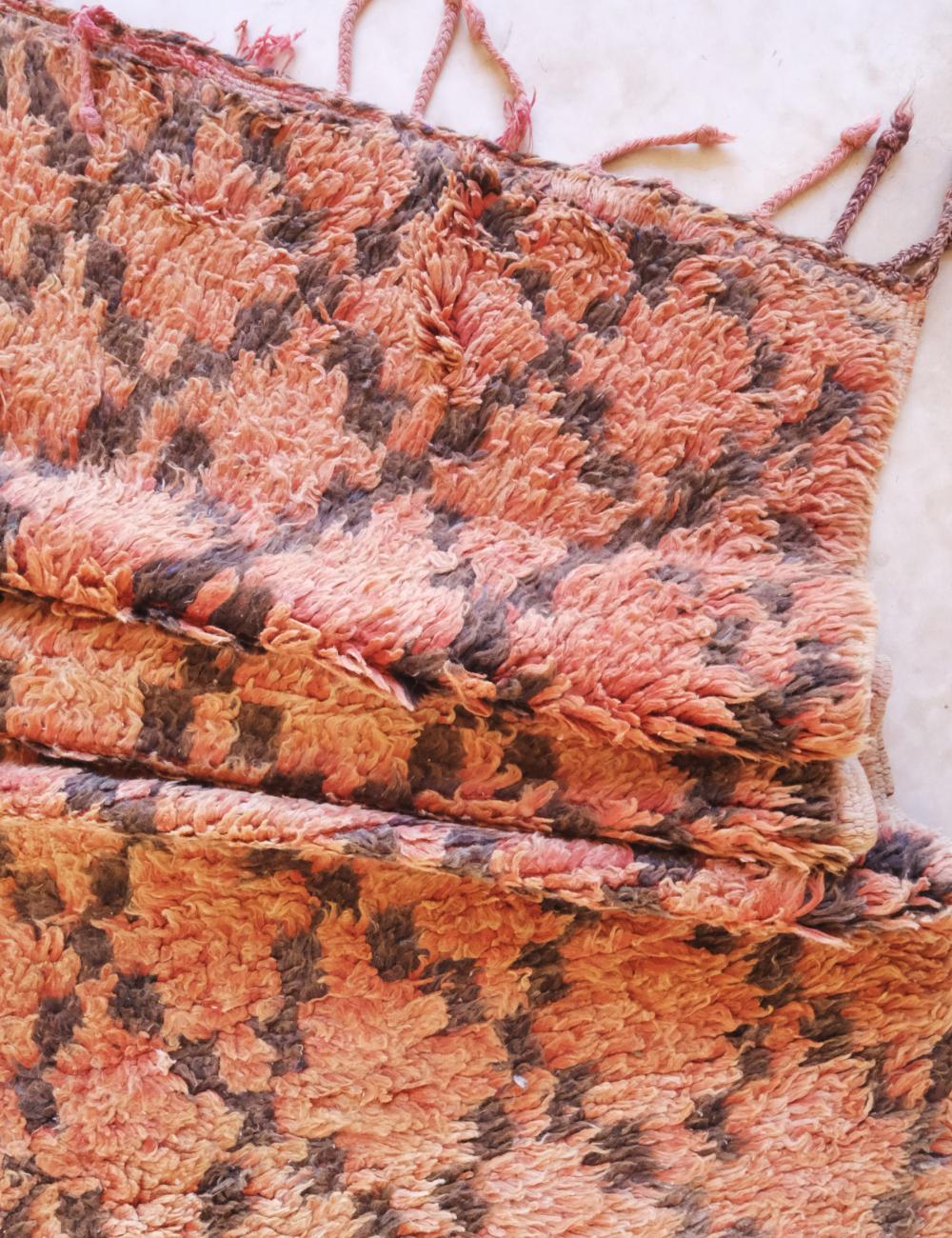 The rug’s repeating diamond motifs symbolize protection and connection — traditional patterns passed down through generations of Moroccan weavers. The rich terracotta tones blend with subtle faded variations, creating a soft, aged patina that feels both rustic and refined. Its textured pile and fringed edge add to its artisanal charm.