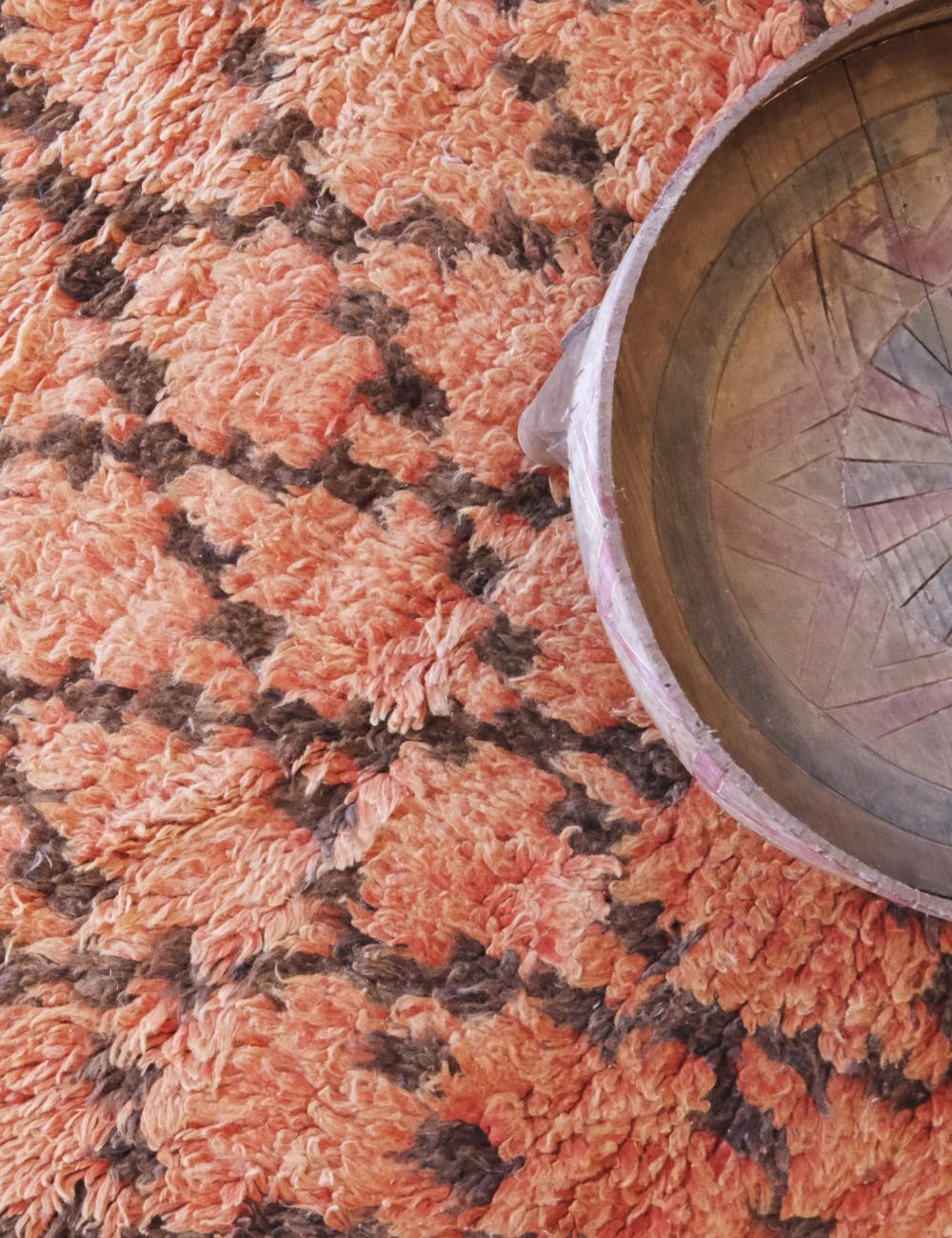 This vintage Boujad rug captures the earthy elegance of Moroccan craftsmanship. Handwoven in the Atlas Mountains by Berber artisans, it features a timeless lozenge lattice pattern in deep brown set against a warm terracotta field. The result is a beautifully balanced rug that radiates warmth, authenticity, and cultural depth.