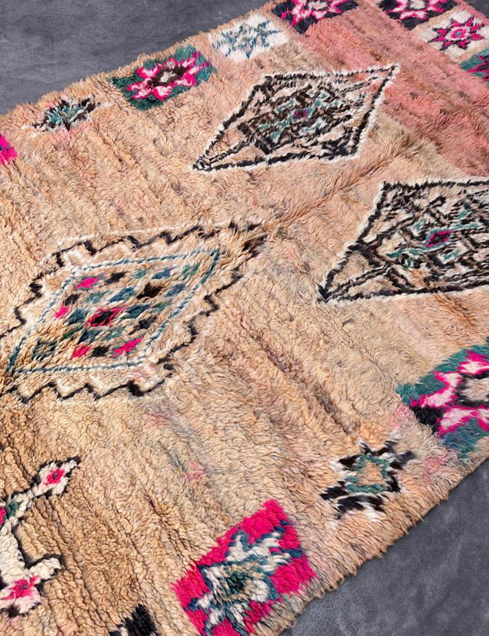 The central composition features layered diamond forms framed by rhythmic geometric elements along the borders. Pops of pink, black, ivory, and muted green animate the warm ground, creating a balanced interplay between structure and spontaneity—an unmistakable hallmark of Boujad textiles.