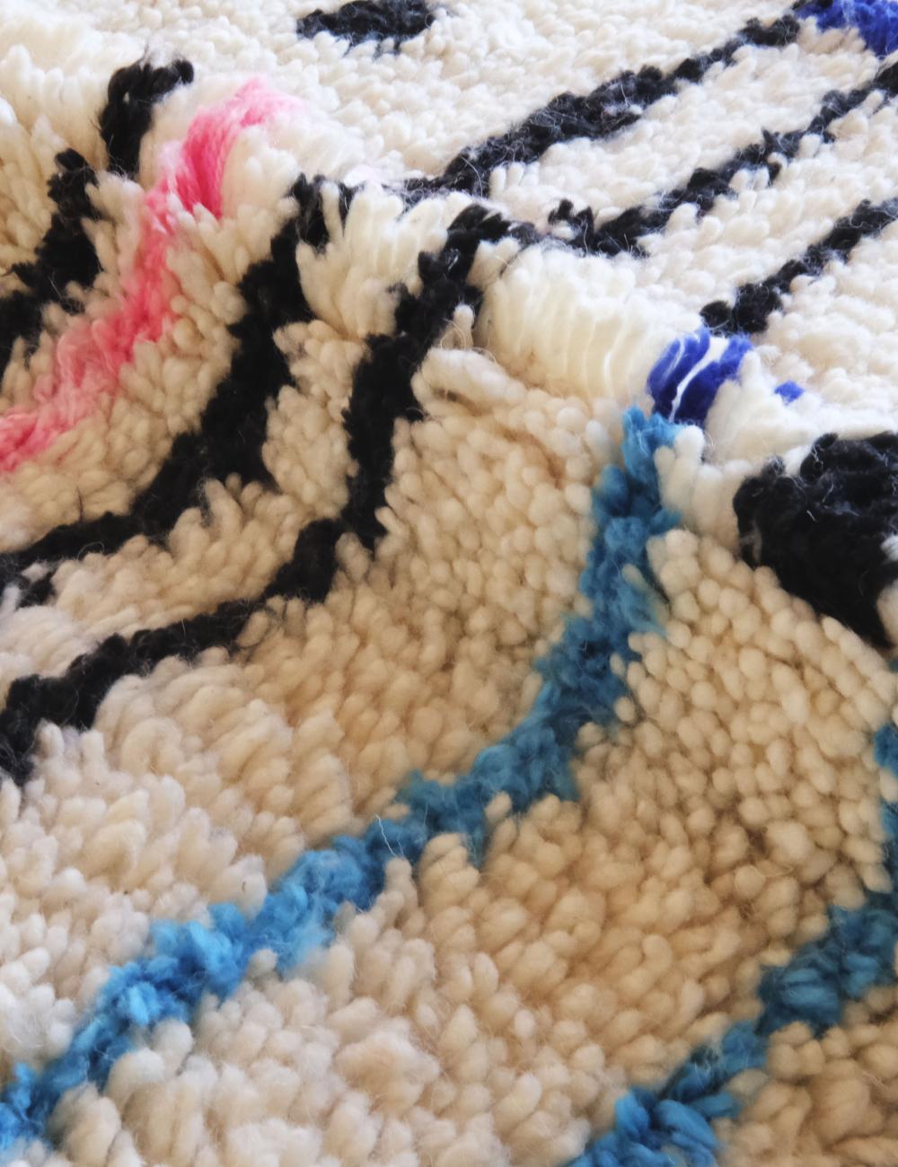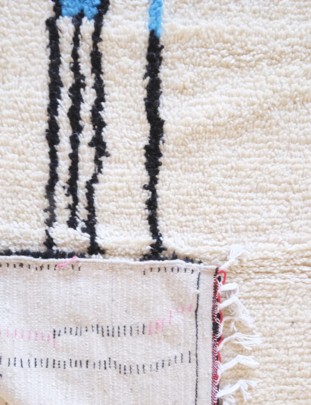 Crafted by Moroccan artisans using traditional techniques, this rug showcases a plush, tactile wool pile with subtle variations in texture and color. Each irregularity is a testament to its handmade nature, making the piece entirely one of a kind. The wool’s natural warmth softens the bold graphic elements, creating a harmonious balance.