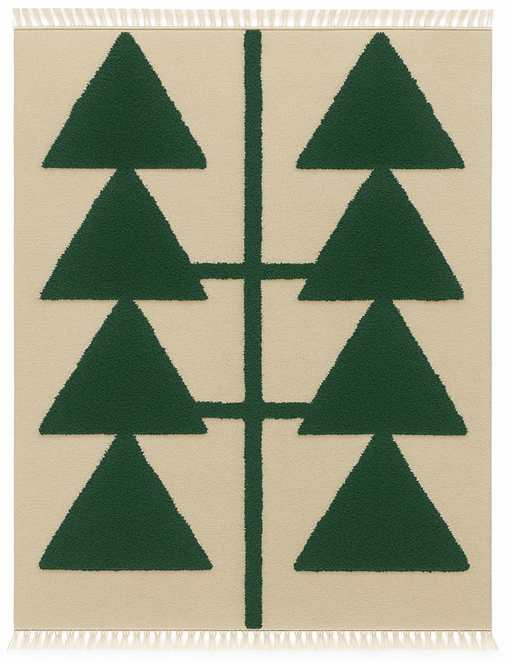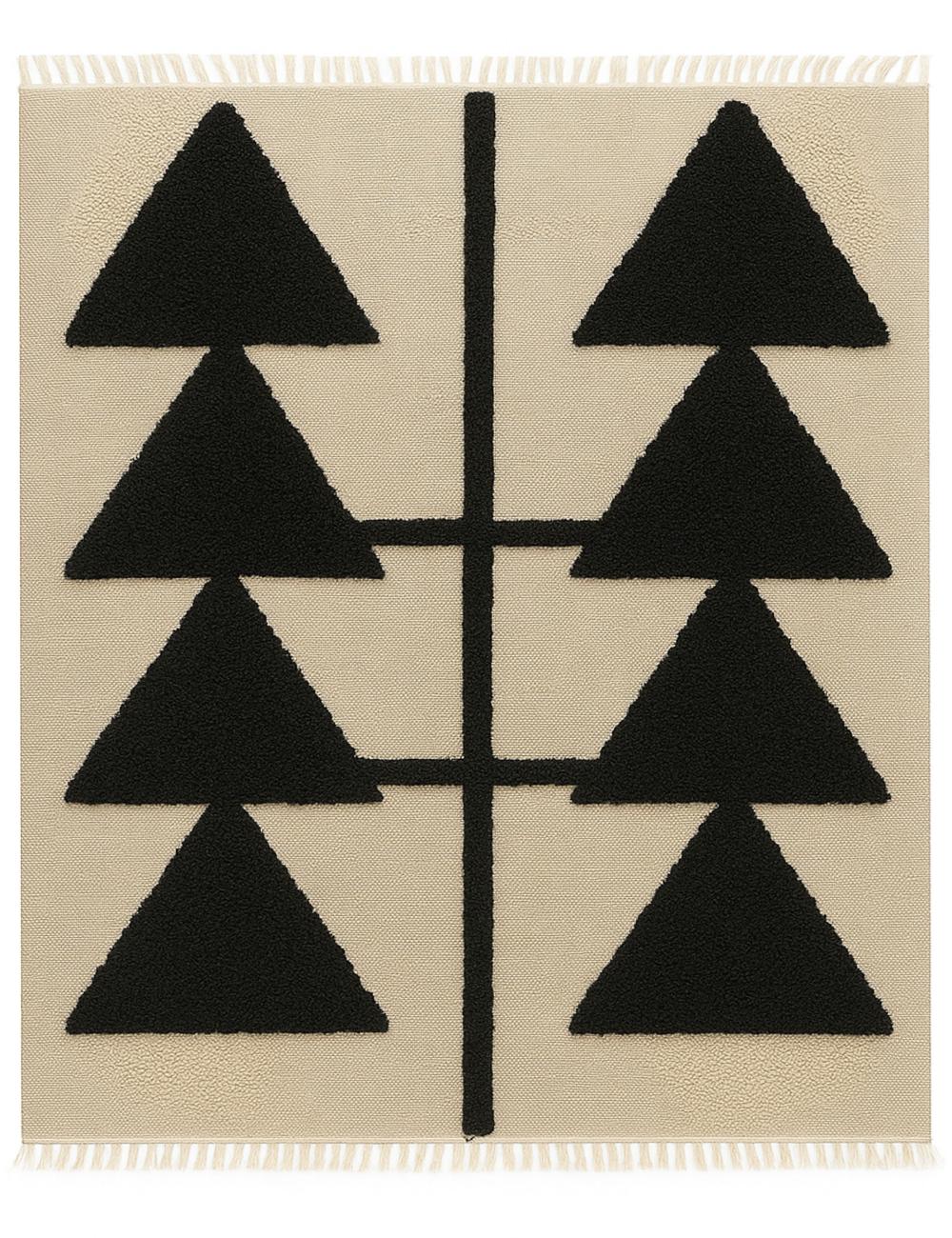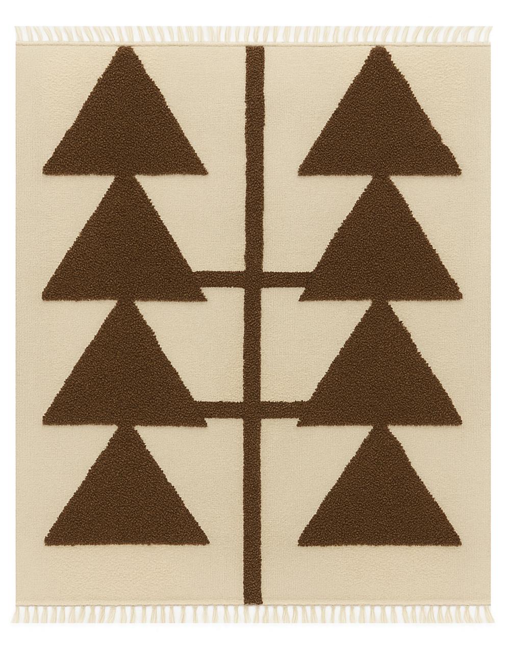 The rug’s composition centers on two mirrored columns of sharp, triangular forms that appear like stylized trees, arrows, or abstract symbols. The strong geometric shapes stand out against a contrasting ground, creating depth, rhythm, and a refined visual balance. The raised textured pile adds dimension and softness, turning a simple motif into a tactile, design-forward statement.