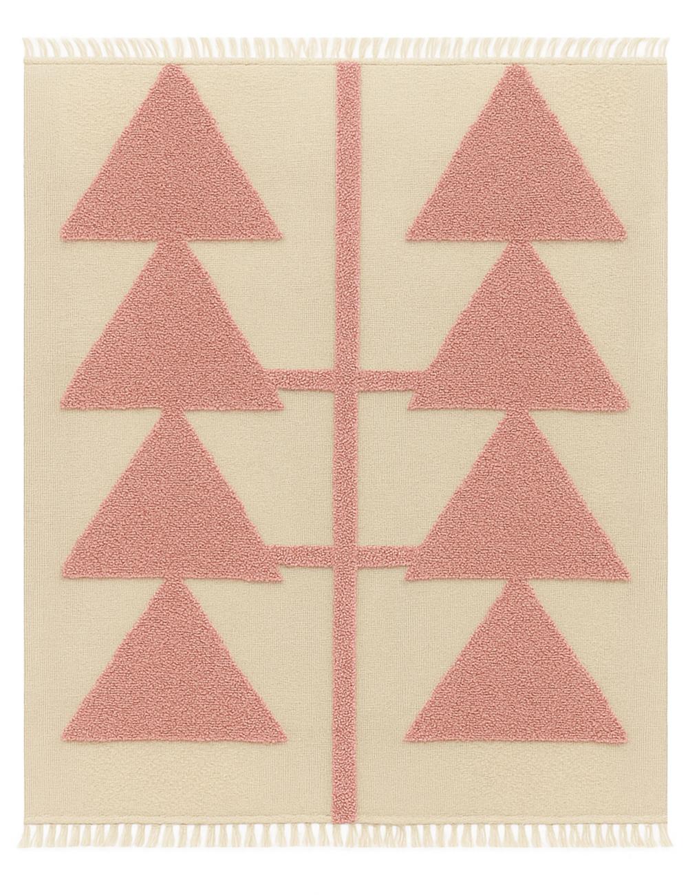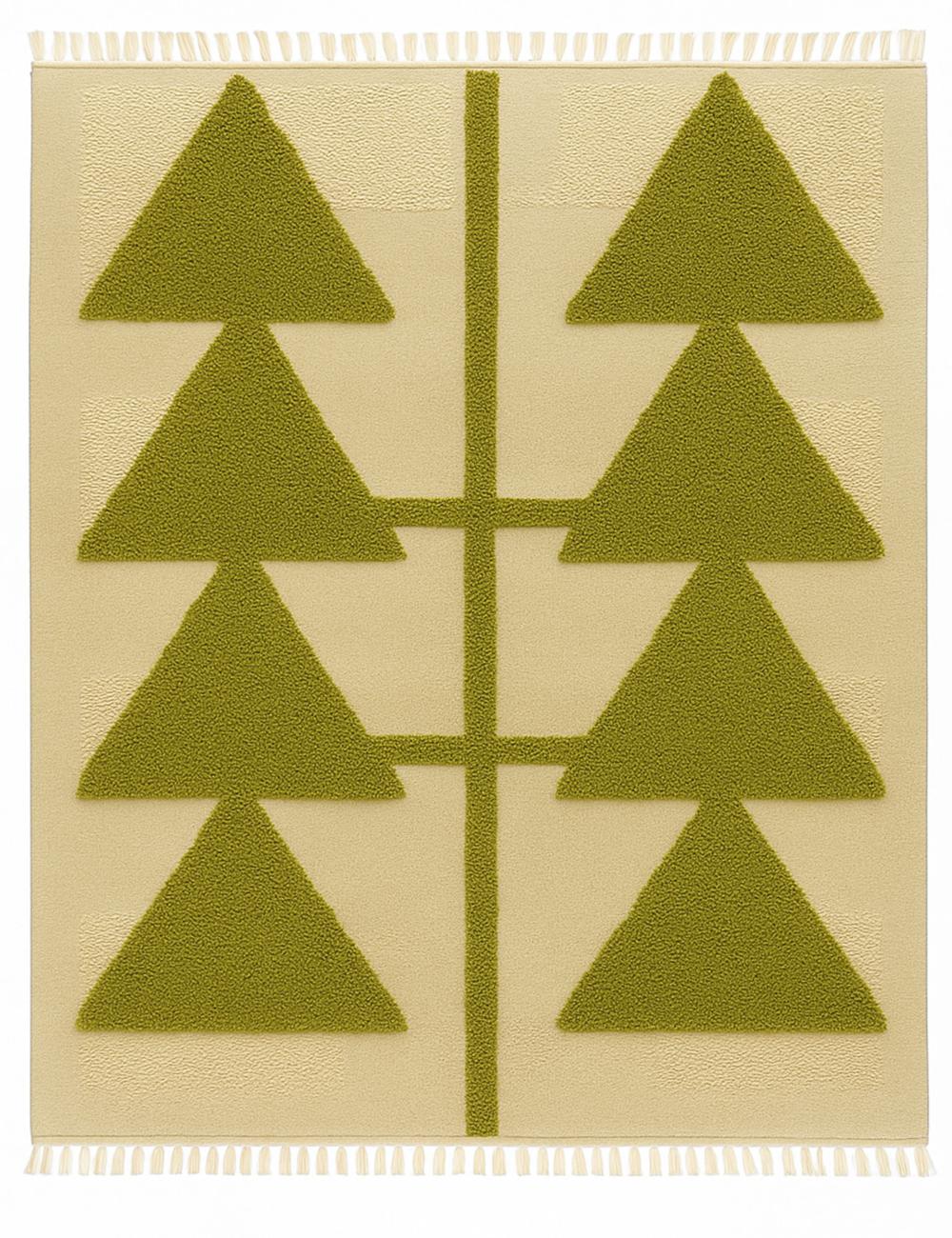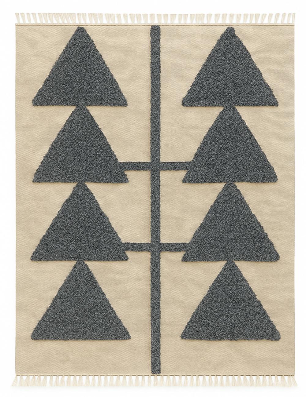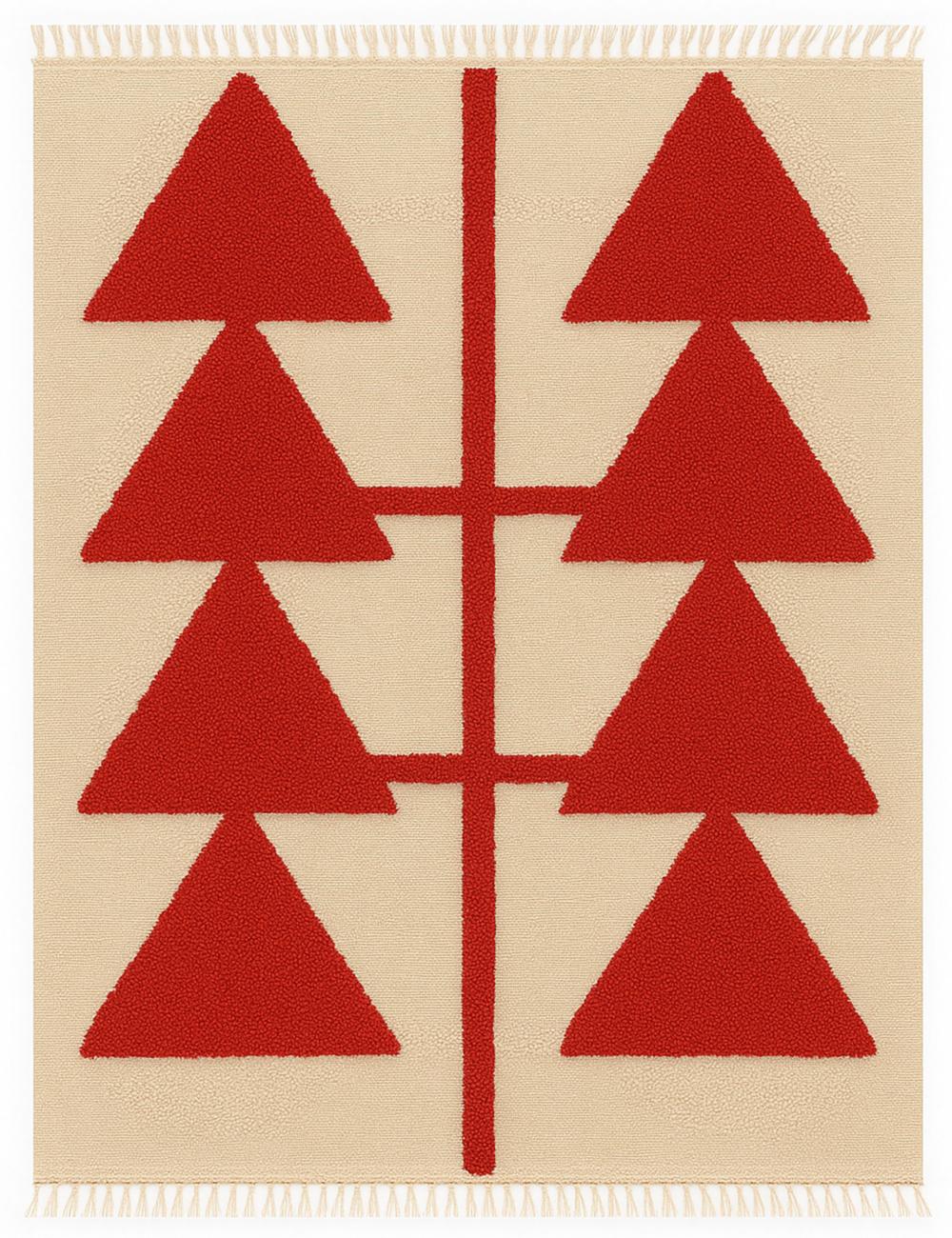 The rug’s composition centers on two mirrored columns of sharp, triangular forms that appear like stylized trees, arrows, or abstract symbols. The strong geometric shapes stand out against a contrasting ground, creating depth, rhythm, and a refined visual balance. The raised textured pile adds dimension and softness, turning a simple motif into a tactile, design-forward statement.