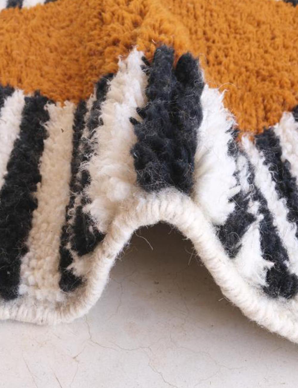 The design is built around a striking geometric composition divided into four large triangular sections that meet at the center of the rug. Two warm ochre panels create a grounding visual structure, while the opposing sections introduce graphic black-and-white patterns. One side features fine horizontal lines, while the other presents a bold checkerboard motif, creating a dynamic contrast between texture, rhythm, and structure.