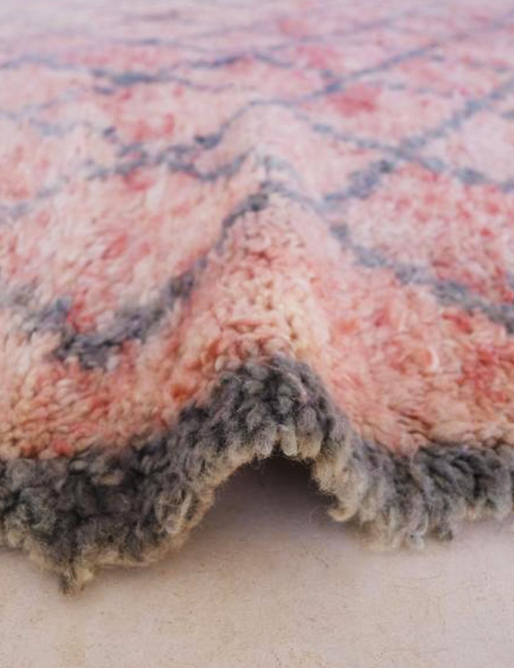 The design features a classic diamond lattice pattern spread across the field, creating a balanced, timeless composition that feels both bohemian and refined. The motif reads clean and graphic from a distance, while up close you’ll notice the nuanced, slightly weathered look that makes vintage Moroccan rugs so special. It’s an easy statement piece that adds texture without overwhelming a room.