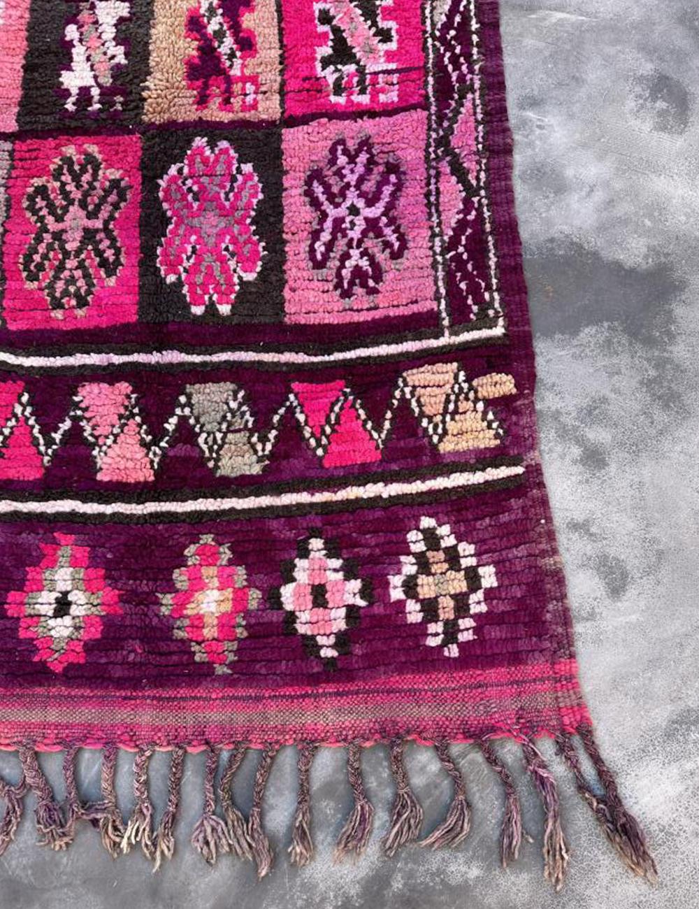 The design features a dramatic central medallion set on a deep plum-purple field, framed by intricate geometric borders and stacked motifs at both ends. Vivid tones of fuchsia, magenta, blush pink, and soft lilac create a bold contrast against the dark ground, while small tribal symbols add rhythm and authenticity. Subtle abrash (natural tonal variation) and slight irregularities are part of the rug’s charm—proof of true vintage handcraftsmanship.