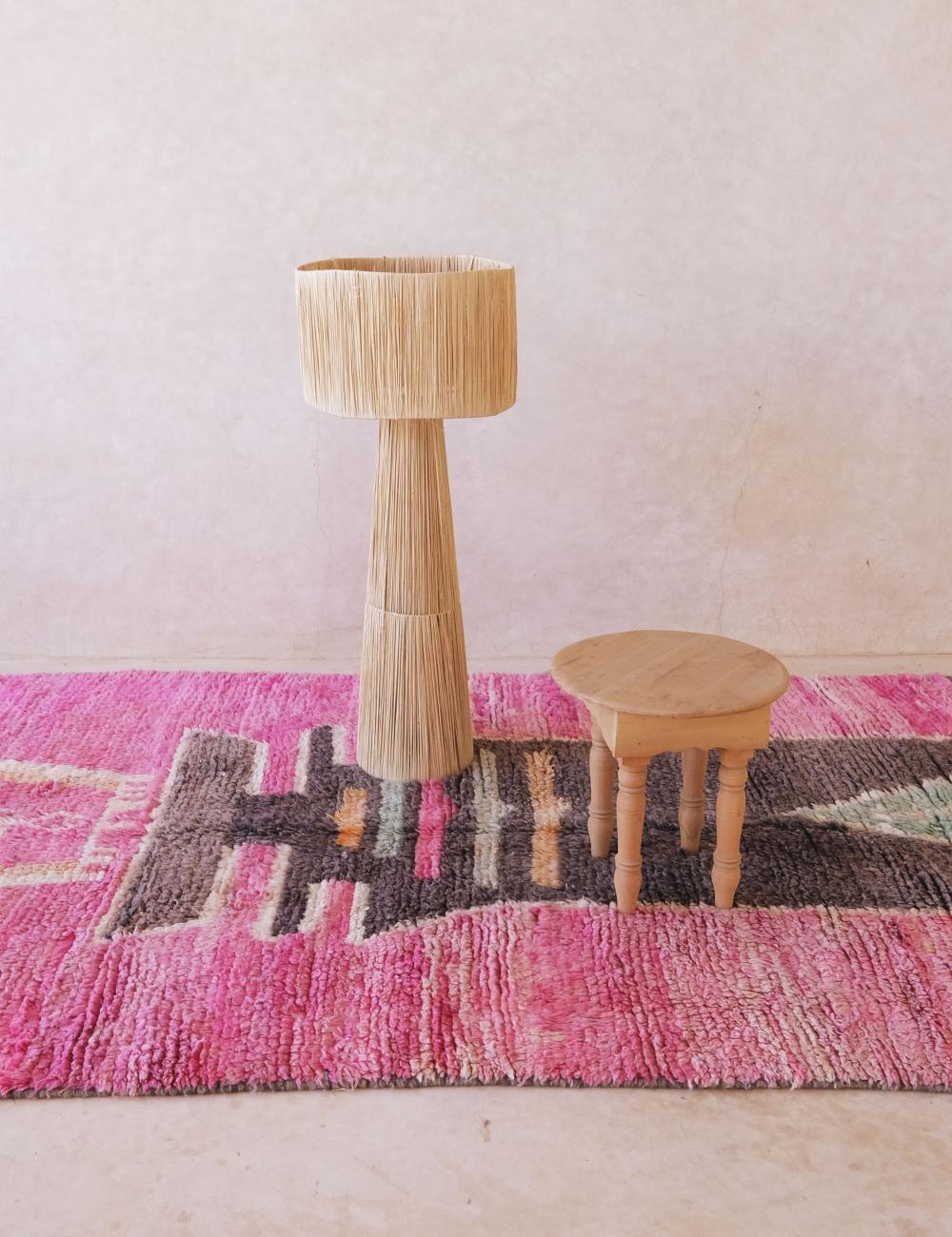 This striking Moroccan wool rug features a vibrant pink backdrop paired with a bold, sculptural central motif—creating a piece that feels both tribal and contemporary. Handwoven by Berber artisans, it carries the expressive spirit of Boujad and Azilal rugs while standing out with its electric color palette and symbolic design.