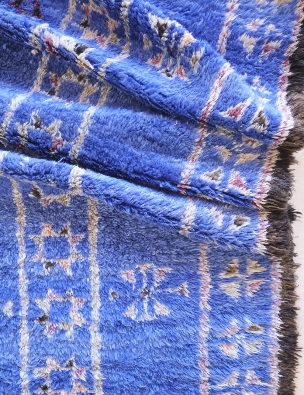 This Moroccan rug is a stunning expression of timeless Berber artistry — rich in color, heritage, and craftsmanship. Handwoven in the Atlas Mountains from 100% natural wool, it features a striking indigo-blue field adorned with delicate geometric and star motifs. Its bold color and intricate symmetry bring both depth and refinement to any modern or traditional interior.