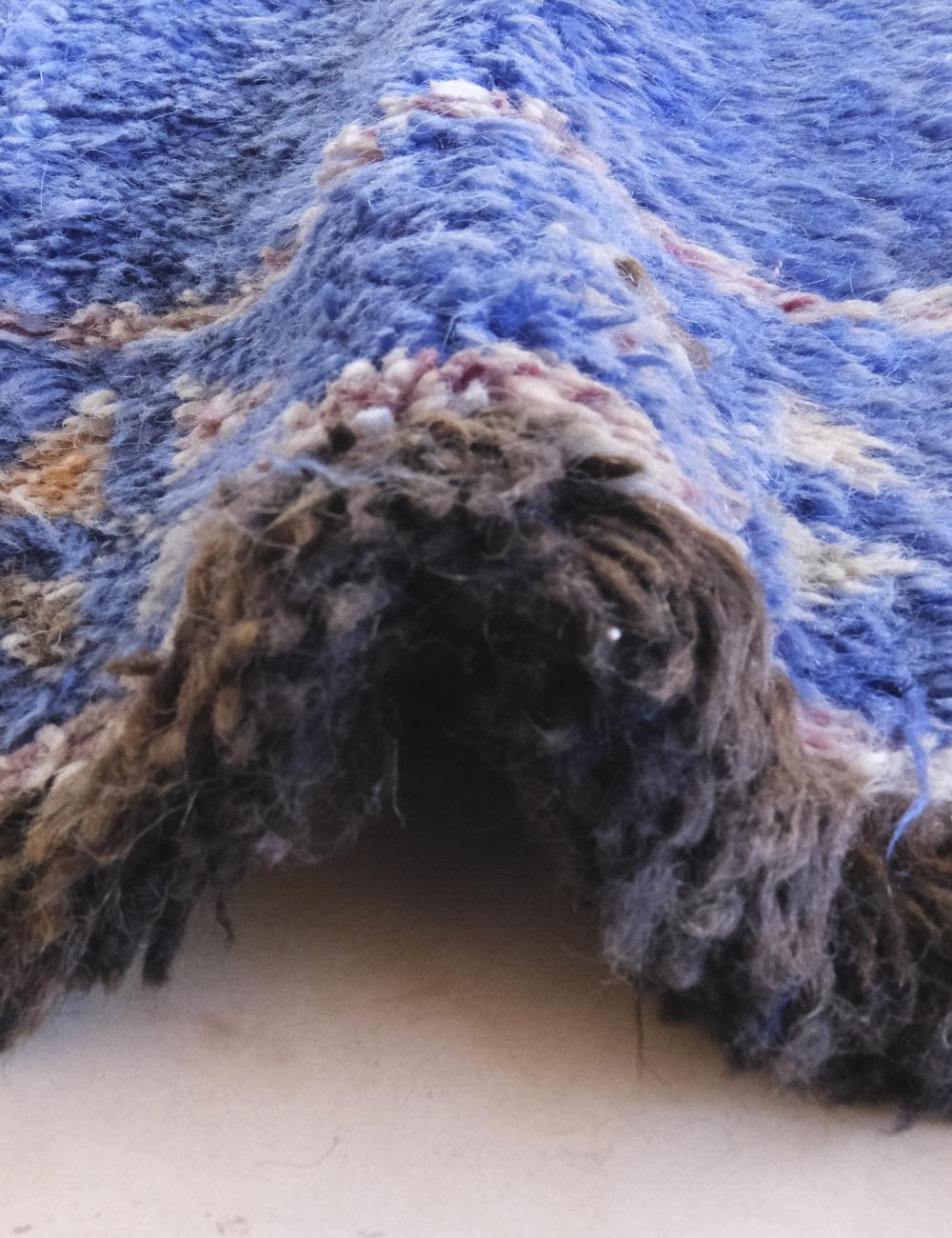 The rug’s deep blue tone, achieved through natural dyeing techniques, evokes the mystery of Moroccan night skies and the serenity of desert horizons. Its linear arrangement of small symbols and crosses represents harmony and connection — hallmarks of Amazigh weaving tradition. The intricate white detailing stands out beautifully against the saturated indigo backdrop.