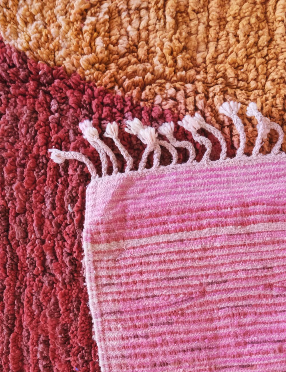 Caring for your Moroccan rug is simple! For regular maintenance, we recommend gently vacuuming it 1-2 times a week (use a suction-only attachment, without a beater bar) and air it outside every few months. For minor spills, act quickly by blotting the area with a clean, dry cloth. If needed, use a small amount of water and a gentle soap. For deep cleaning, we strongly recommend seeking a professional rug cleaner who specializes in wool carpets to preserve the rug's natural fibers and vibrant colors for years to come.