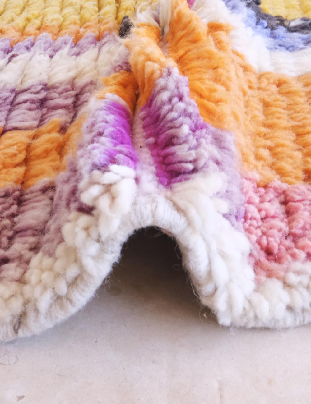 Caring for your Moroccan rug is simple! For regular maintenance, we recommend gently vacuuming it 1-2 times a week (use a suction-only attachment, without a beater bar) and air it outside every few months. For minor spills, act quickly by blotting the area with a clean, dry cloth. If needed, use a small amount of water and a gentle soap. For deep cleaning, we strongly recommend seeking a professional rug cleaner who specializes in wool carpets to preserve the rug's natural fibers and vibrant colors for years to come.