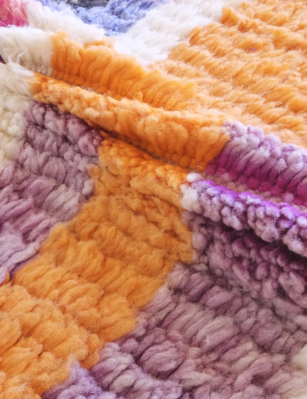 Inspired by modernist art and Berber symbolism, the rug’s design flows with organic shapes and color blocks that blend harmoniously. The mustard background radiates warmth, while vibrant hues bring depth and dynamism. Each detail reflects the spontaneity and creative freedom that define modern Moroccan weaving.