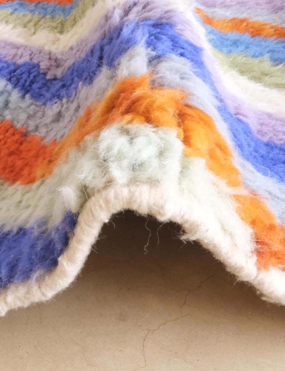 Made to order, this rug can be customized in size and alternative color combinations to suit your project. Natural wool provides resilience, insulation, and a luxuriously soft underfoot feel. As with all handmade Moroccan rugs, slight variations in pile direction, stripe width, and texture are part of the artisanal process, giving each custom piece its own character.