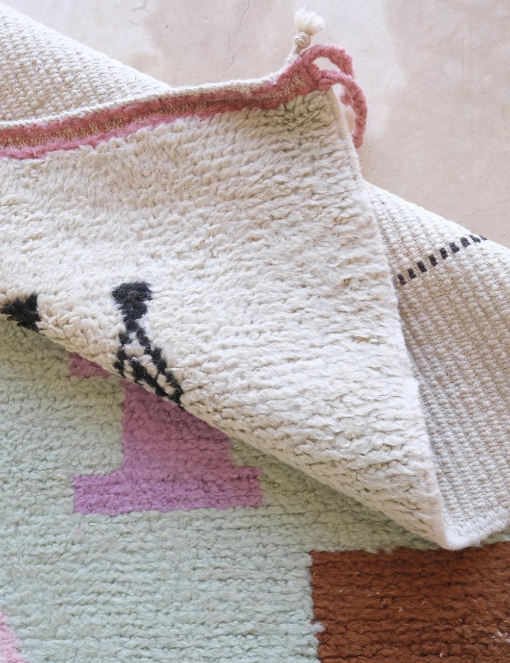 Caring for your Moroccan rug is simple! For regular maintenance, we recommend gently vacuuming it 1-2 times a week (use a suction-only attachment, without a beater bar) and air it outside every few months. For minor spills, act quickly by blotting the area with a clean, dry cloth. If needed, use a small amount of water and a gentle soap. For deep cleaning, we strongly recommend seeking a professional rug cleaner who specializes in wool carpets to preserve the rug's natural fibers and vibrant colors for years to come.