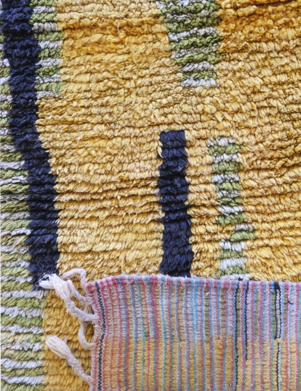 This modern Moroccan runner rug is a bold fusion of color, craftsmanship, and design — perfect for hallways or narrow living spaces that need a touch of warmth and personality. Handwoven by Moroccan artisans using 100% natural wool, it features an abstract geometric pattern in mustard yellow, olive green, and deep charcoal with a soft touch of burgundy.