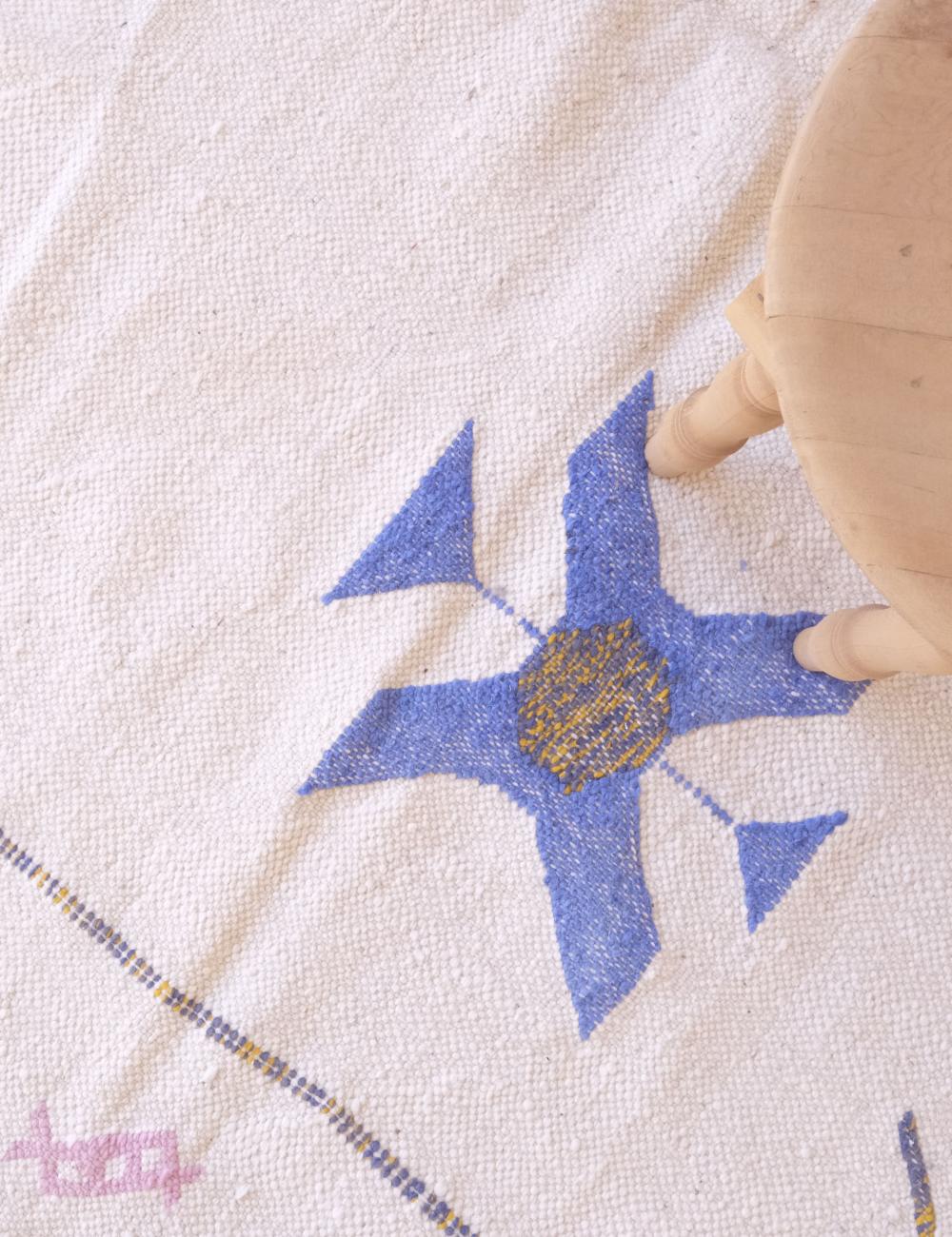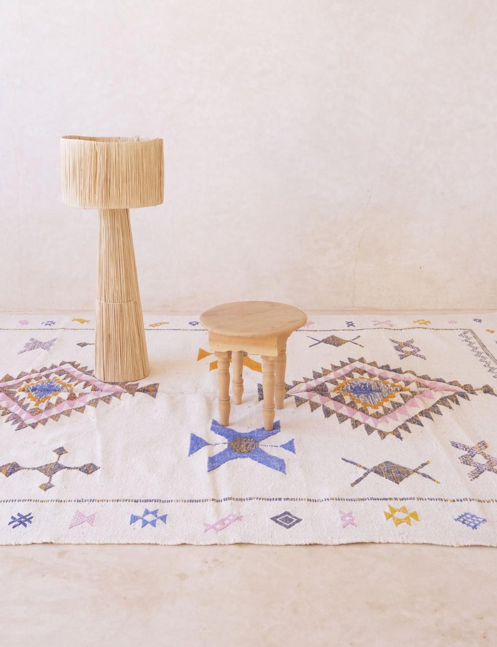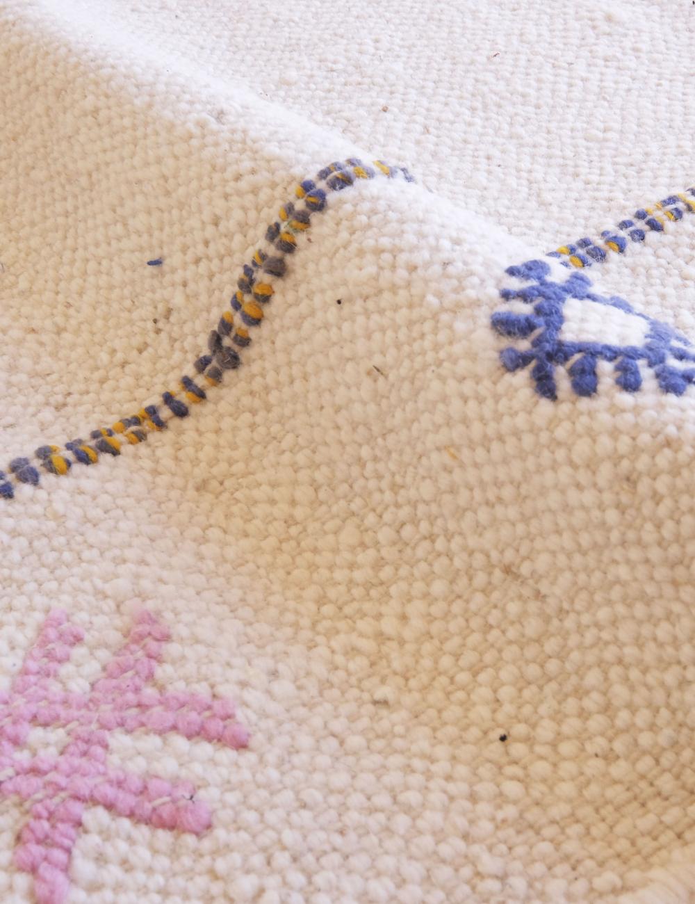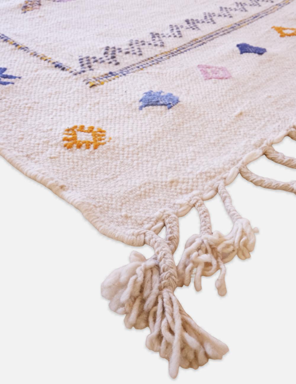 This handwoven tribal kilim rug is a beautiful expression of Berber artistry, blending traditional motifs with a light, modern palette. Crafted from natural wool and woven flat for a sleek, versatile finish, it brings subtle color, symbolism, and texture to any interior while maintaining a timeless authenticity.