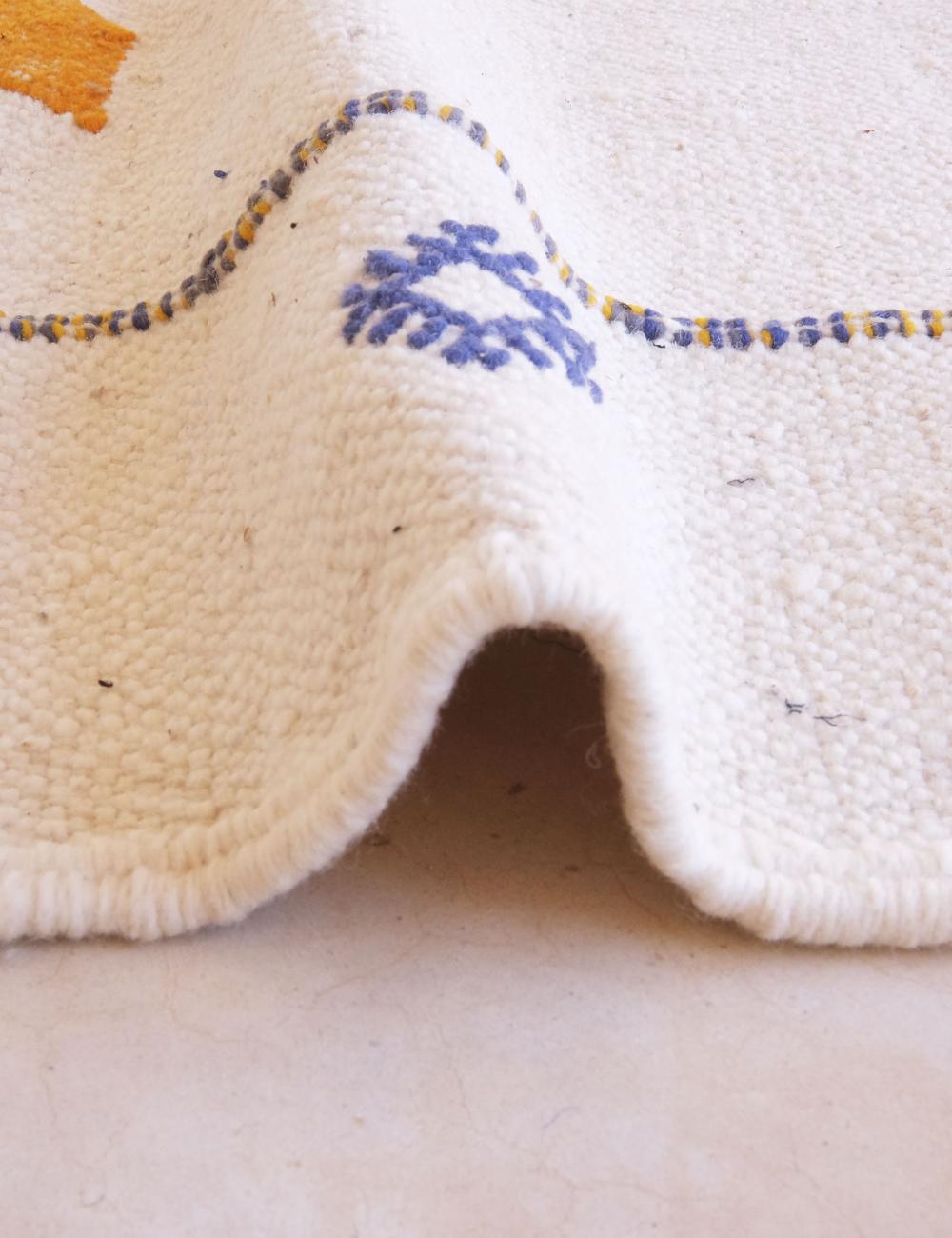 Handwoven by Moroccan artisans using traditional kilim techniques, this rug showcases crisp lines and a smooth, durable weave. The flatwoven structure makes it lightweight, easy to layer, and suitable for high-traffic areas, while the natural wool ensures comfort underfoot. Subtle irregularities in texture and color speak to its handmade nature and add character.