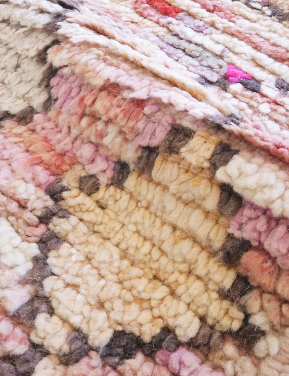 Set against a soft neutral background, the rug’s mosaic of multicolored diamonds captures the essence of Moroccan design — geometric precision infused with free-spirited creativity. The subtle irregularities and handwoven variations give it a natural charm, turning every inch into a tapestry of color and texture.