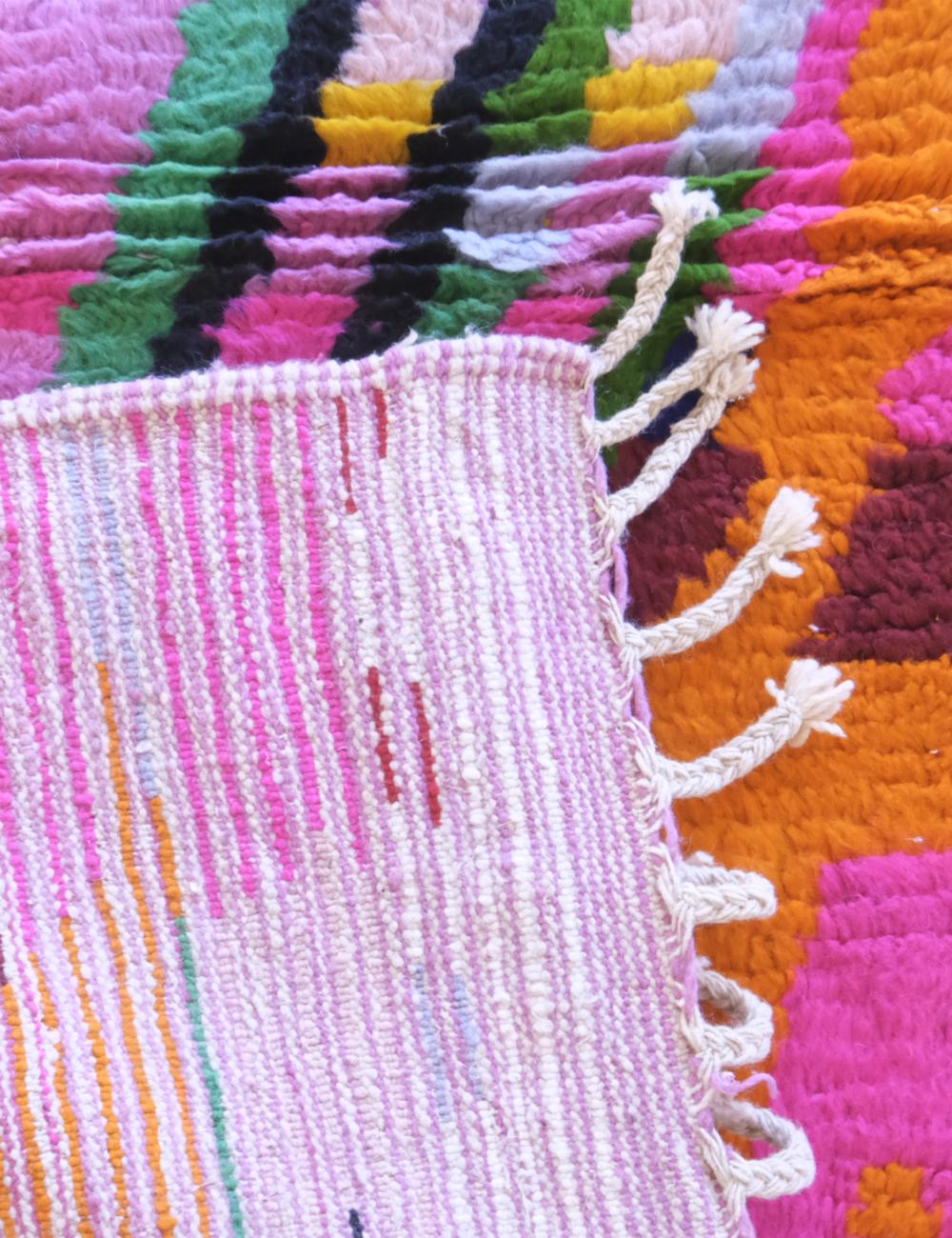 Infuse your space with creative energy through this small Moroccan wool rug, bursting with vivid colors and abstract charm. Handwoven by skilled artisans, it’s a joyful mix of pink, orange, green, and deep red — arranged in spontaneous, painterly forms that feel alive and expressive.