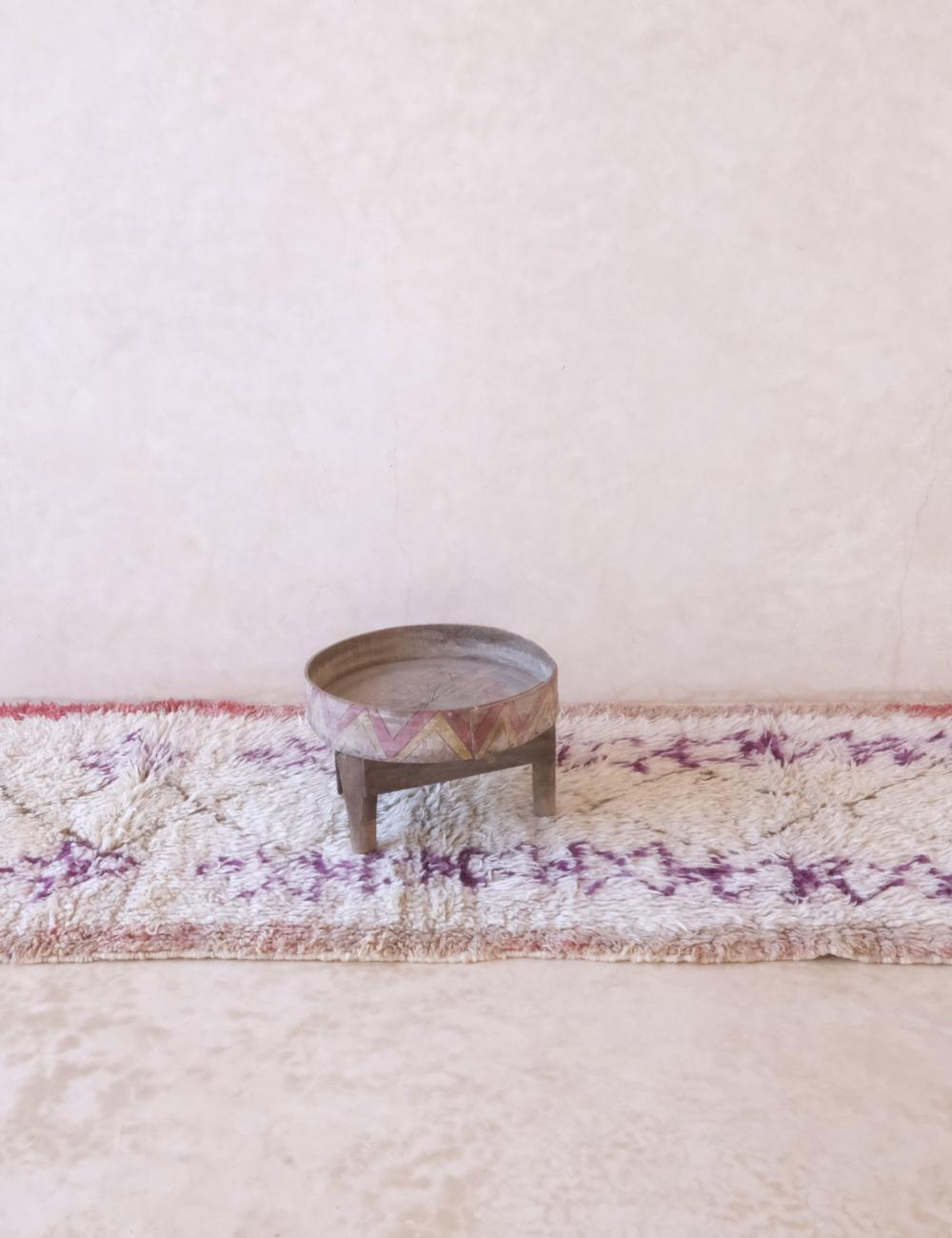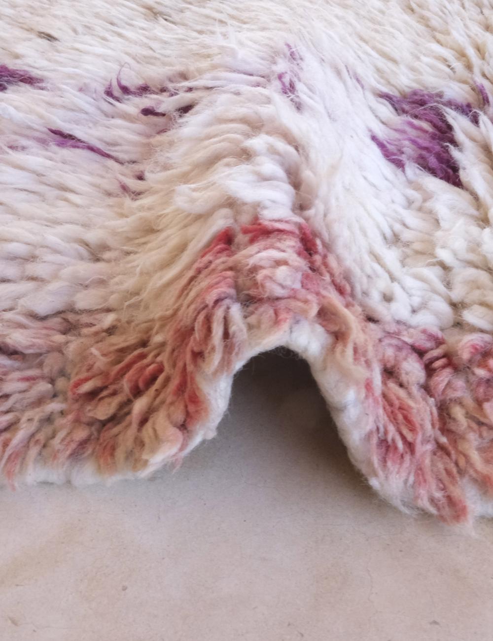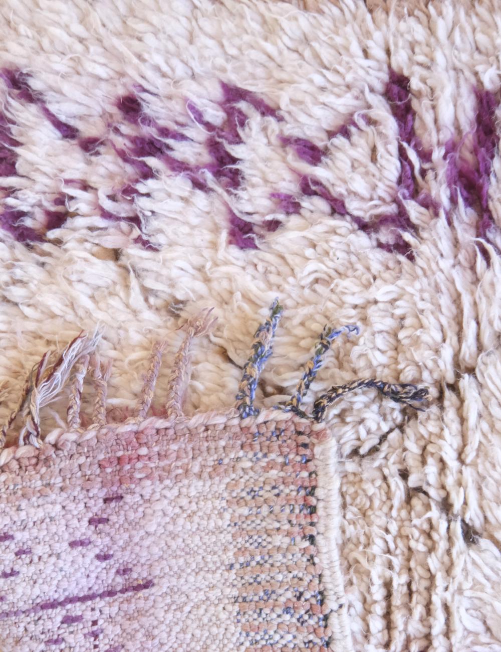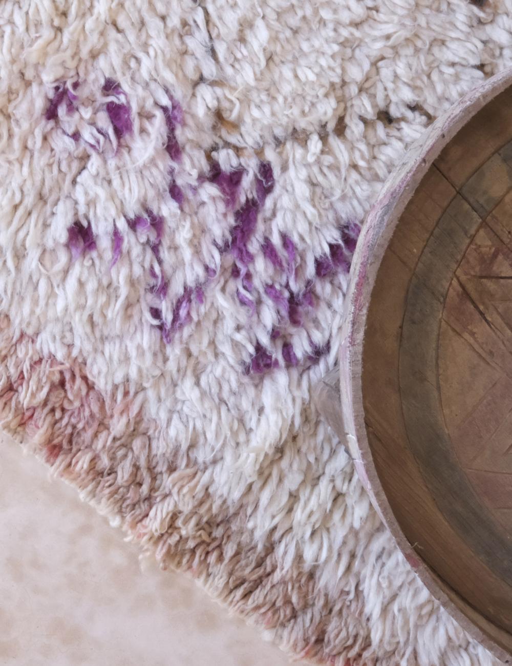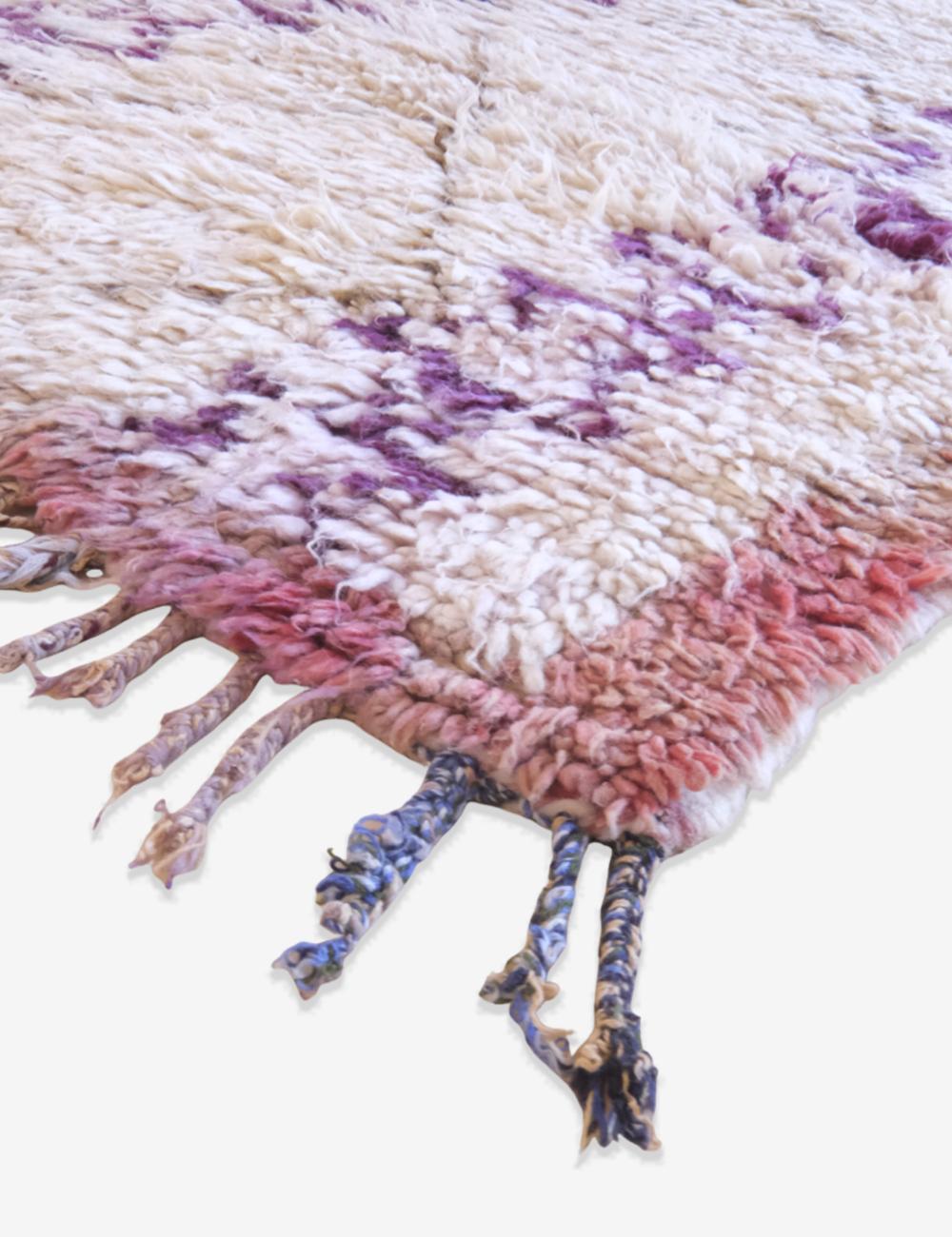 This vintage Azilal rug is a poetic expression of Moroccan artistry — minimalist yet full of emotion. Handwoven by Berber women in the High Atlas Mountains, it features a creamy ivory base accented with delicate purple and blush pink motifs, creating a subtle yet striking visual rhythm that feels both contemporary and timeless.
