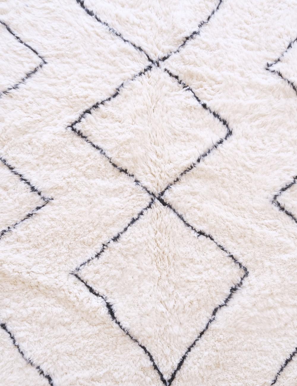 The generous, plush pile offers exceptional softness underfoot, while the graphic pattern remains airy and balanced—hallmarks of classic Beni Ourain design. Subtle asymmetries and natural tonal variations reflect the handmade nature of the piece, adding warmth and authenticity.